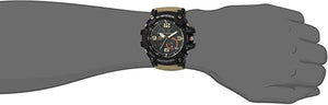 The band surface is processed to resemble a cloth band texture, and the hour and minute hands are shaped with points that make them resemble warning markers. All buttons have a checkered surface for surer operation, and the overall design is tough and rugged.