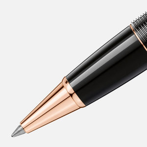 The Meisterstück Rose Gold LeGrand is shaped from deep black precious resin, forming the body and cap of this elegant rollerball, which has become a true luxury icon far beyond writing culture. Gleaming rose gold-coated fittings and the white star emblem complement the refined aesthetics.