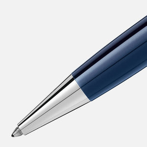 The Meisterstück Le Petit Prince Classique Ballpoint Pen in deep blue precious resin is inspired by the dark blue universe sky. The cap, milled with a fox face pattern, reveals a sentence from the Le Petit Prince book and is crowned with the iconic emblem. The central ring of the three platinum-coated rings features the Montblanc brand name and the clip is embellished with a yellow lacquered star.