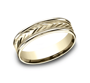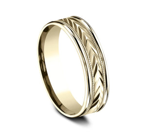 This remarkable 6mm comfort-fit carved design band features a variety of directional arrows along the center with a high polished round edge for a unique but classic look.