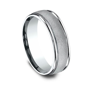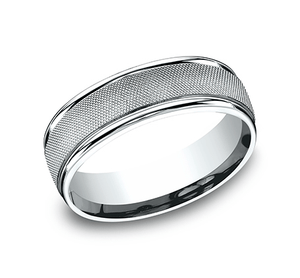 This stylish 7mm comfort-fit carved design band features a Florentine finish center framed by high polish round edges.