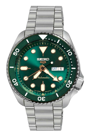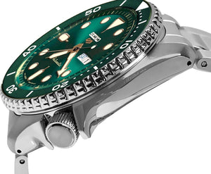 This is a new Seiko automatic 5 Sports watch that features a Seiko 24 jewel automatic (self-winding, hand wind, hacks) movement. The green dial has a day and date display at 3:00, highly luminous hands and markers treated with Lumibrite for low light visibility, an offset crown at 4:00, a uni-directional rotating bezel, a Hardlex mineral crystal and an exhibition window screw-down case back. 42.5mm diameter stainless steel case. It comes on a stainless steel bracelet with a deployant clasp.