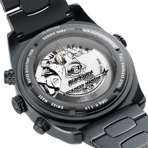 Black PVD-plated stainless steel case, screw down crown & case back