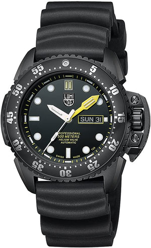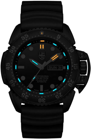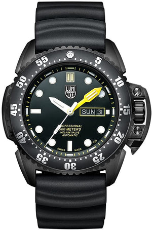 Uni-directional rotating bezel with black or blue aluminum ring, bezel locker at 3h, crown protector