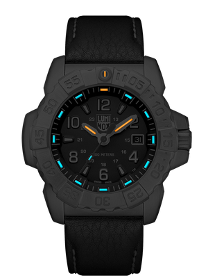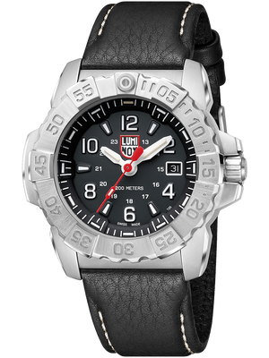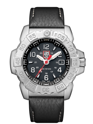 Black leather strap with white contrast stitches, with brushed stainless steel signature buckle