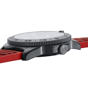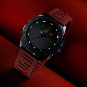 Model 3121.BO.RF is a black on black (blacked out dial, black bezel and black case) eye-catcher coming with a red cut-to-fit strap and featuring water resistance to 200 meters, screw in crown and case back, sapphire crystal and, of course, the Luminox Light Technology, which guarantees constant night visibility for up to 25 years.