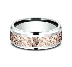 We've hand hammered over the surface of our pebbled finish to create a unique pattern on this 8mm comfort-fit two tone band.