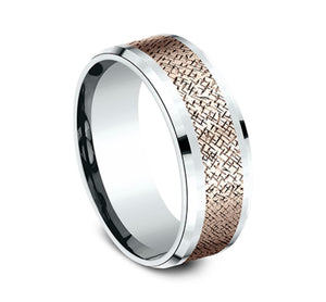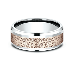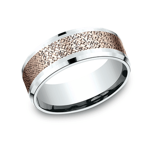 A random cross hatch pattern creates a uniquely one of a kind finish on this 8mm comfort-fit two-tone design ring.