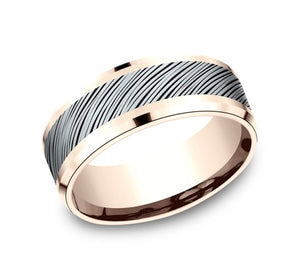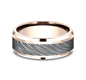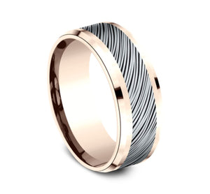 The wear resistant black detailing on this 8mm two-tone ring creates a beautifully organic diagonal bark design.