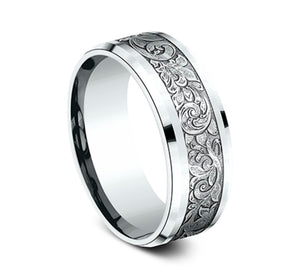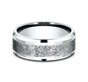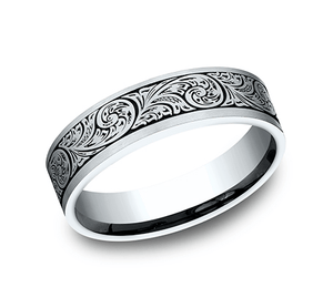 The vintage feel of this 6mm comfort-fit floral scroll design ring is intensified by the antique effect of the wear resistant black detailing