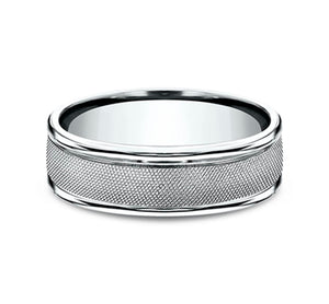 This 7mm comfort-fit ring features a Florentine finish center framed by high polish beveled edges.