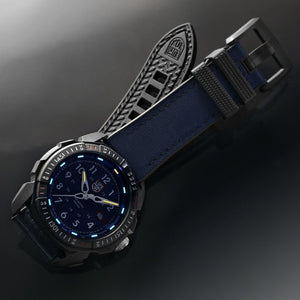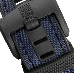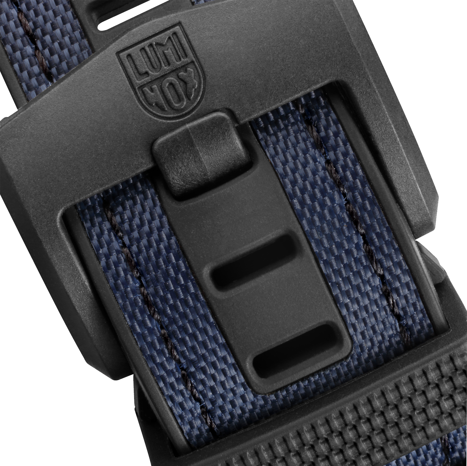 Blue genuine rubber signature strap with blue textile inlay, blue stitching and CARBONOX™ signature buckle, 24mm