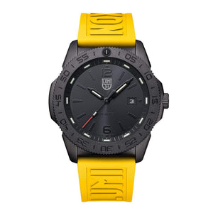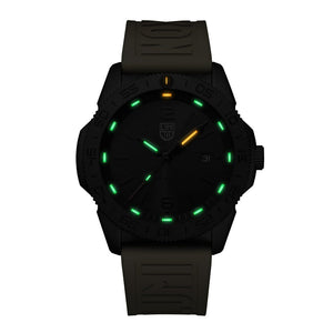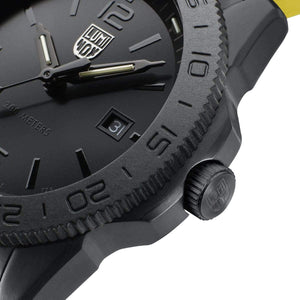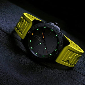 Model 3121.BO.GF is a black on black (blacked out dial, black bezel and black case) eye-catcher coming with a yellow cut-to-fit strap and featuring water resistance to 200 meters, screw in crown and case back, sapphire crystal and, of course, the Luminox Light Technology, which guarantees constant night visibility for up to 25 years.